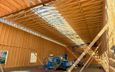 平面は約11mx27m、天井高さは約5.5m。そして11m側の一面には持ち出し屋根が5mという倉庫躯体を、壁は2”x6”、屋根はライトフレーム(ネイルプレート)トラスとLVLの組み合わせの計画で納品させていただきました。建設は香川県三豊市の田中建設さん。
