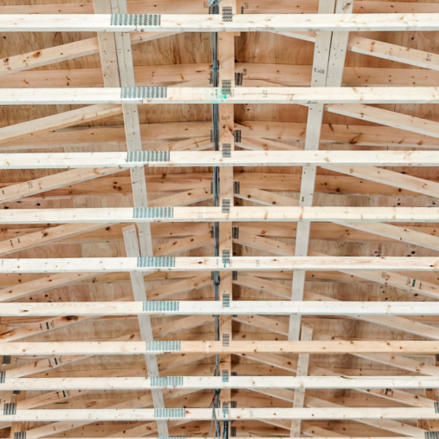 広々とした無柱空間をLVL、Iジョイスト、ネイルプレートトラスなどを組み合わせ、