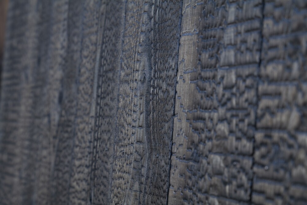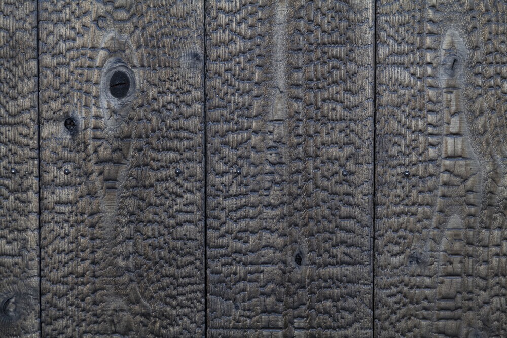 素焼。焼いて表面を炭化させることによって、板の劣化を遅らせようとして考えられた、古来よりある焼杉です。