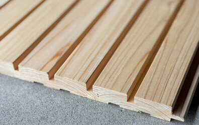 厚みのある原板から、深溝のリブ加工パネリングのサンプルをつくりました。 無節上小の美しい愛媛県産桧です。