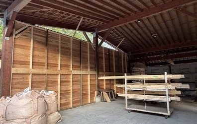 三秋プレイス内のY棟と言う、壁の無い柱だけで構成している建物があります。今までは4方向からの木材の取り出しができるようにと言う理由で壁を設けていませんでしたが、この度、機械設備を設置する為に壁をつくりました。