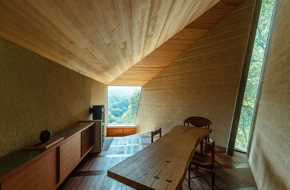 アトリエは、土地の形が難しかったんですよね。平らな場所が非常に限られていた。敷地の地形に沿って建てるというのは、昔から色々な建築家がやってきたことですけど、もう一歩進んで「建物が土地に食い込んだような形にしたらどうか」と考えました。