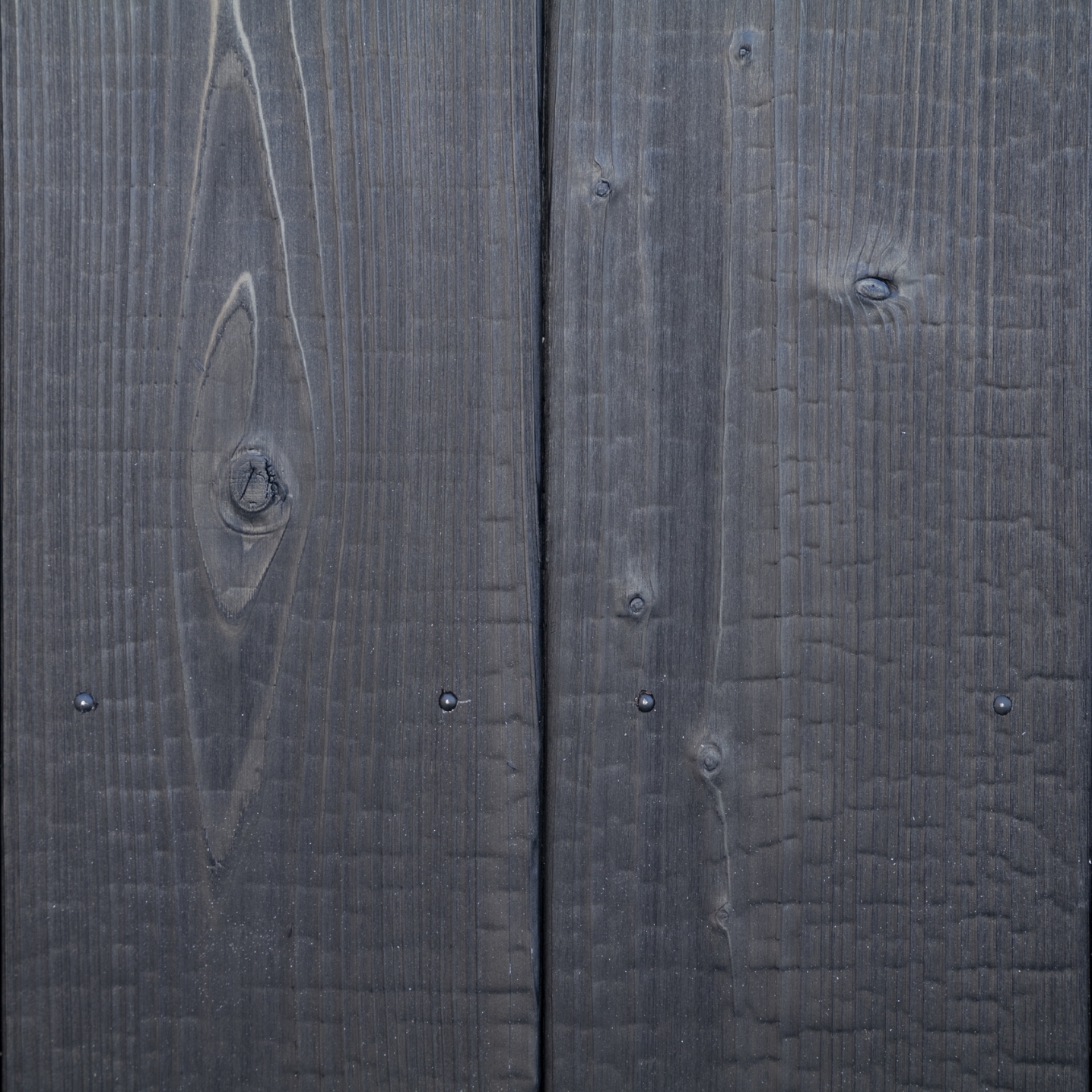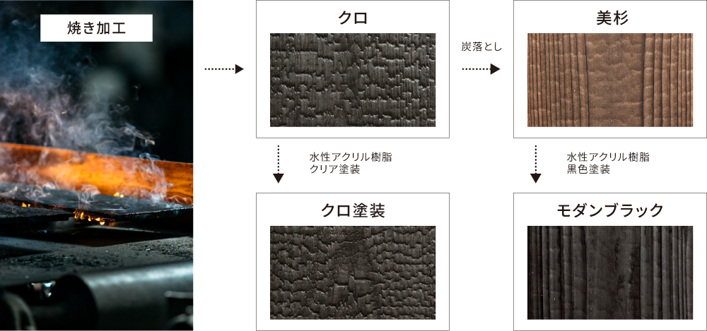 共栄木材では、昔からある素焼の焼杉だけではなく、表面の炭を軽く落としたもの、焼杉に塗装をしたものなど、様々な焼杉を製造しています。