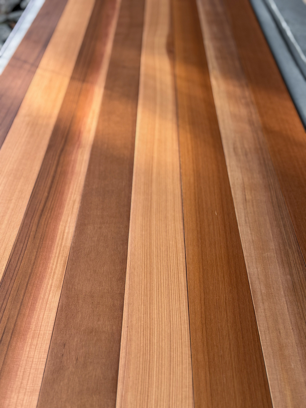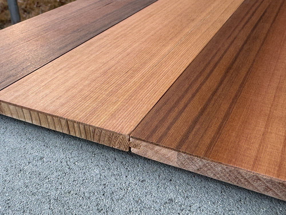 そこで、今回の<WRC複合パネリング>をご紹介です。基板は全てWRCで作り、その上に1.5㎜厚のWRCを貼りました。サイズは88x10mm。長さは2,440、2,735、3,050、3,660㎜です。また、WRCは基本的にクリア塗装で仕上げられるので、OSMOの#3062(フロアクリア)を塗布しています。もちろんJAS☆☆☆☆商品です。