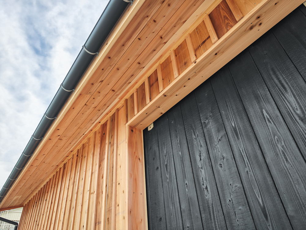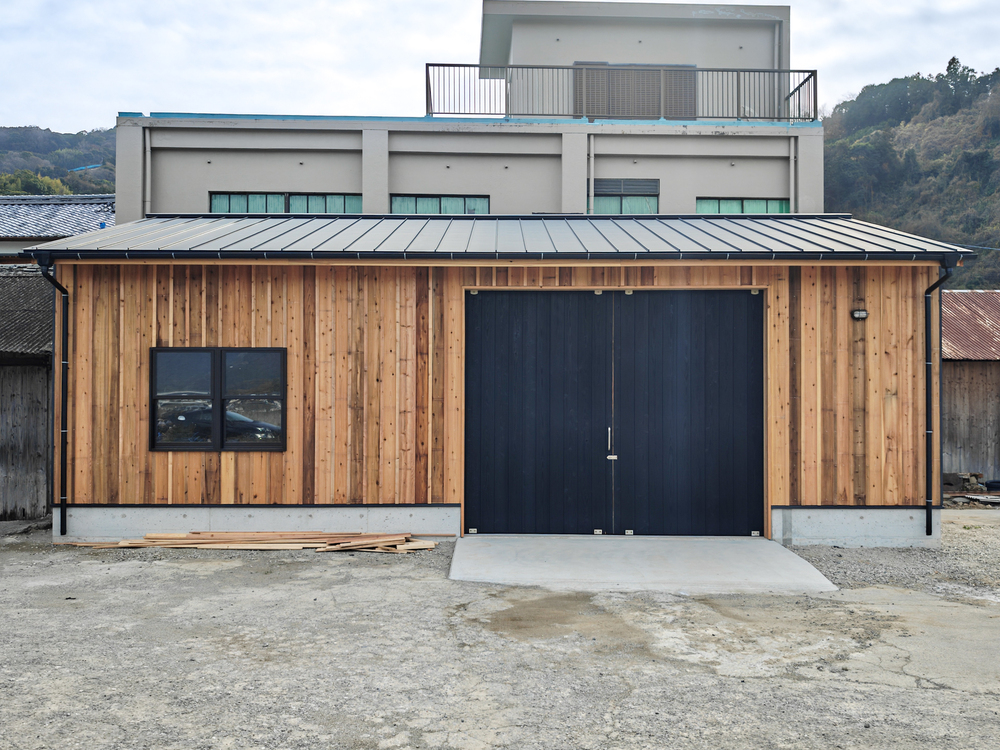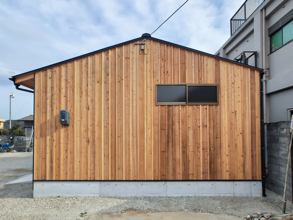 外壁・軒天には杉板張りを、倉庫扉には焼杉のモダンブラックを用いています。