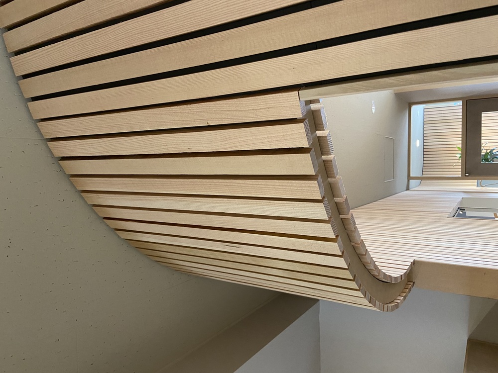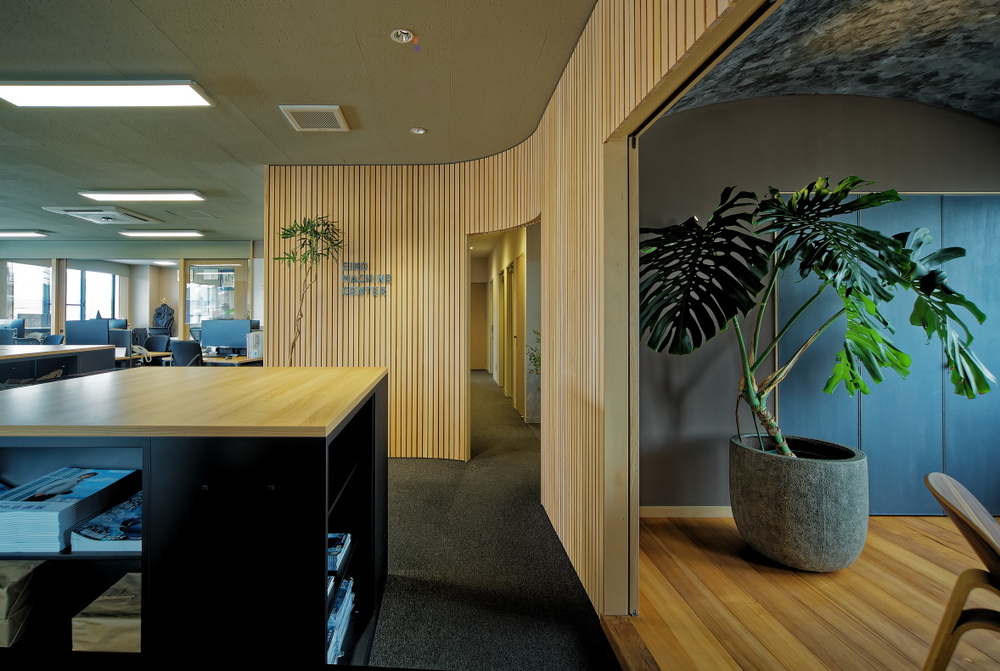設計の武長さんからは、「オフィスで働く人・訪れる人にとって核となる部分に共栄木材の材を採用し、左官や塗装など他の素材と共に空間を引き立てています。」との嬉しいお言葉をいただきました。