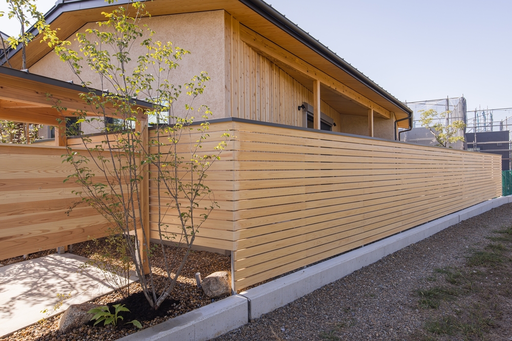 エクステリアにヒノキ・クリアフェンスとヒノキ・クリアデッキを、外壁には杉のボード&バッテンをご使用いただきました。