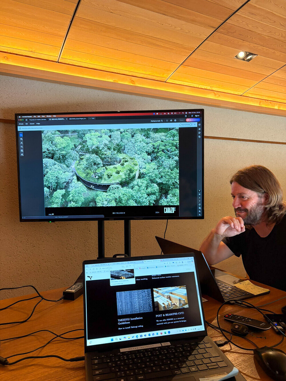 During our meeting, we discussed potential uses of our YAKISUGI (charred cedar) and other timbers across several projects, including a private residence. We look forward to seeing these projects progress step by step—and to the day when Japanese wood takes root in Costa Rica. We also hope to visit their country at the next opportunity.