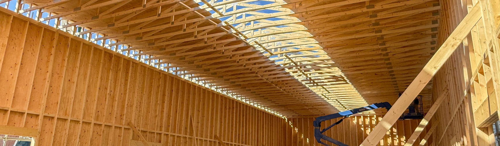 11mの大きなスパンと5mの持ち出し屋根という運送業の課題を、ネイルプレートトラスと高強度のLVLによって解決。 木造での無柱空間を実現しました。 施工:株式会社田中建設