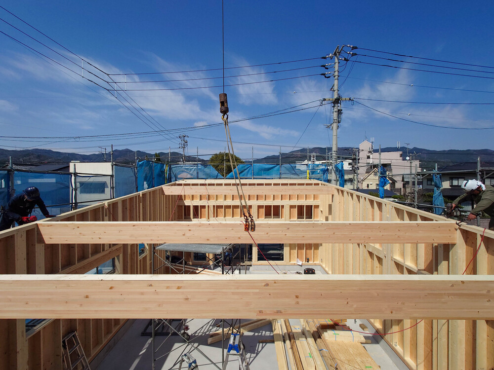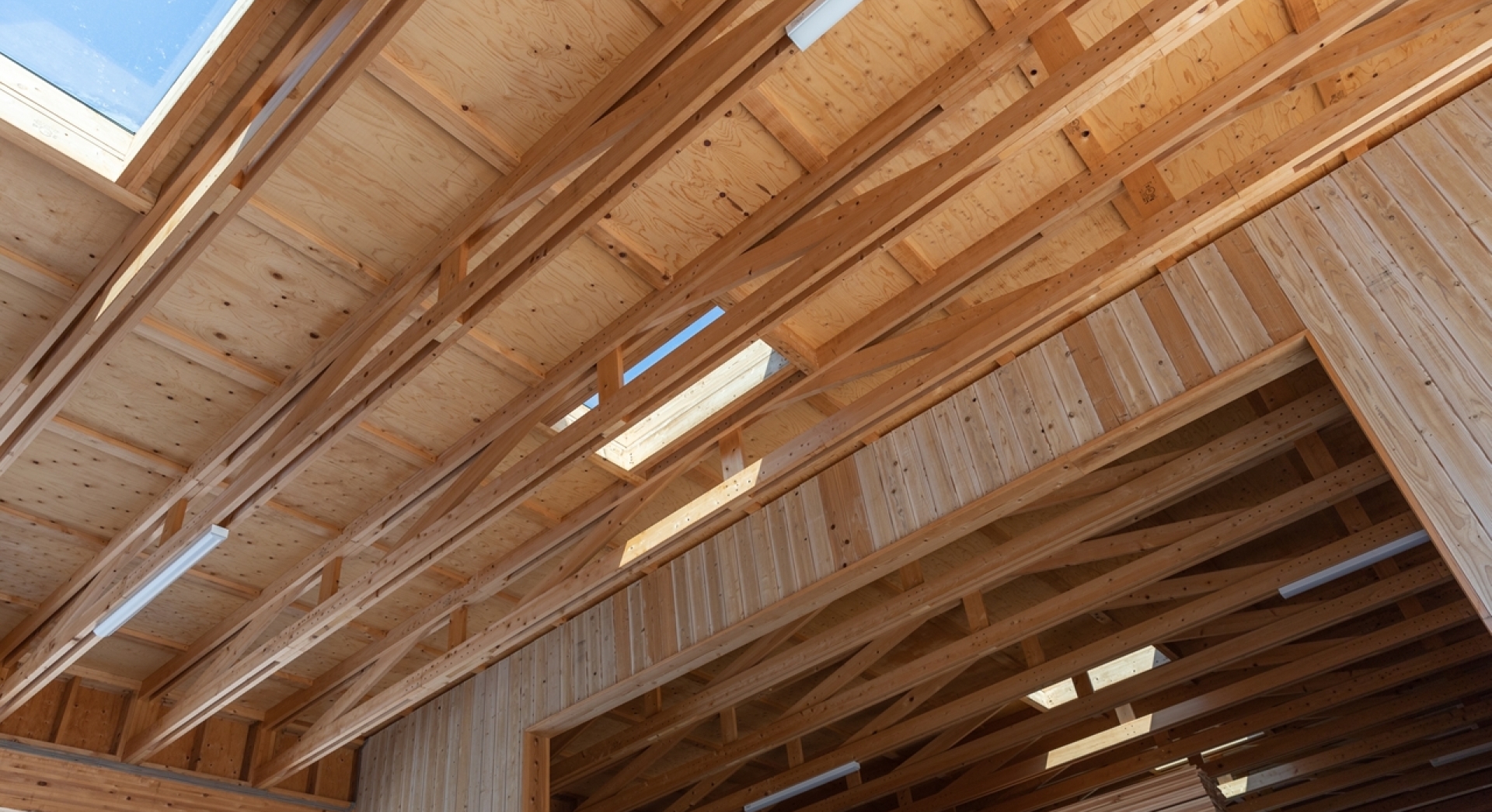 杉・桧・SPFなどのディメンションランバーをビスで緊結したトラスや、金物・構造用集成材を活用して大きな無柱空間を実現します。