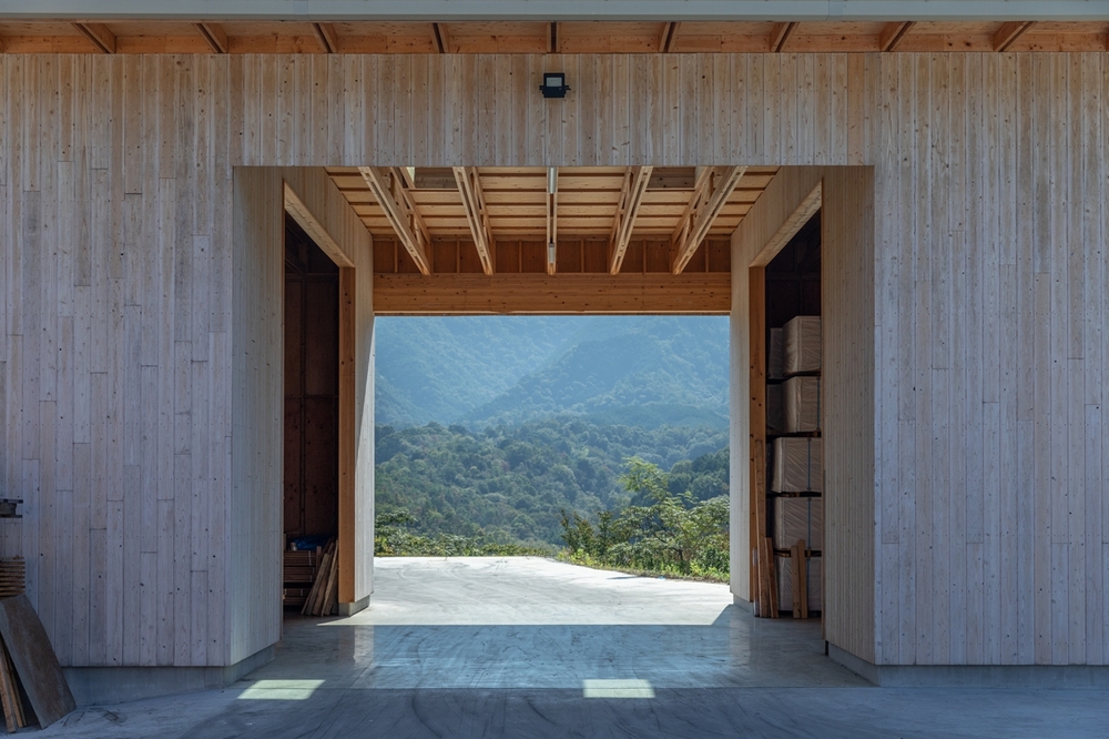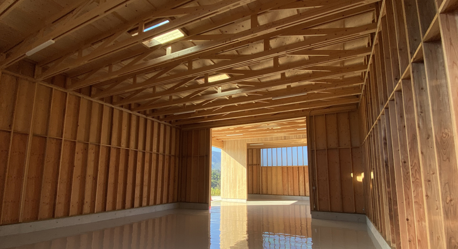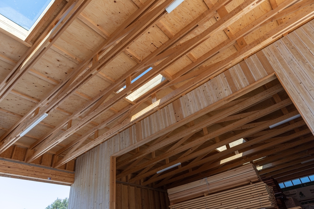 枠組壁工法で杉のスタッド、桧のトラスを構造材とした倉庫です。