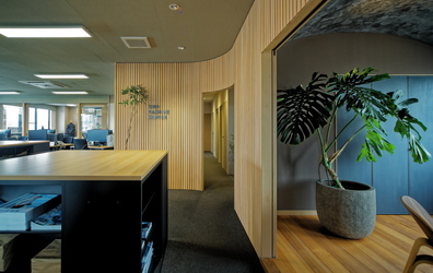 設計は、関西・大阪を拠点とするアット設計室/武長晃弘さんです。 「栄光マシーンセンター本社」改修の内装材に、ラーチ(カラマツ)グリッド・ラフソーン仕上と、チークAB積層フローリングをご使用いただきました。