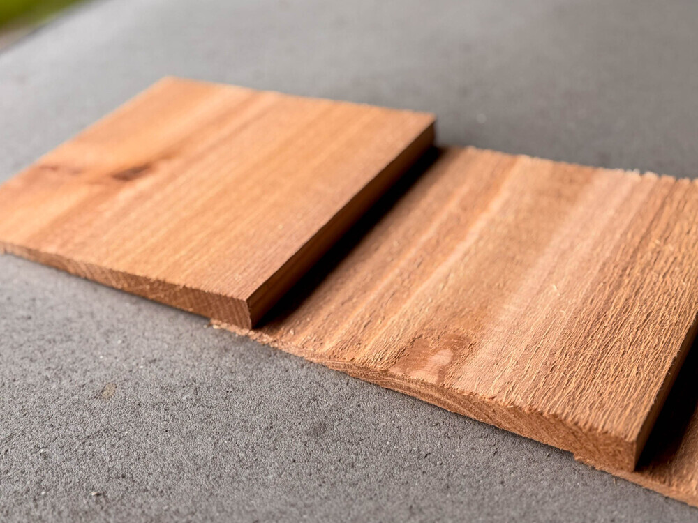 断面が三角形になっている横張り用の外壁材の加工形状です。 よろい張り(下見板張り)にできるので、重ねて施工することで、特有の陰影が生まれます。 WRC(レッドシダー)が有名ですが、国産杉など、様々な樹種に応用可能です。