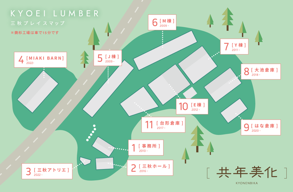 三秋プレイス全景 さまざまな大スパン木造倉庫があります