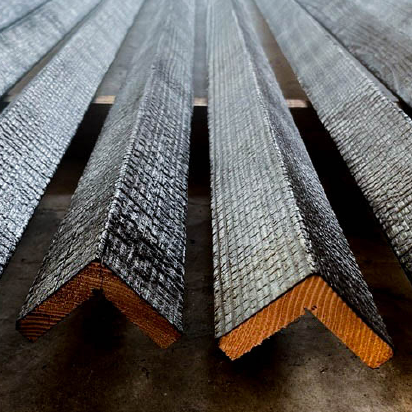 焼杉(焼き杉板)は、杉板を焼いて表面を炭化させた商品です。表面の炭化層が、板の劣化を遅らせます。