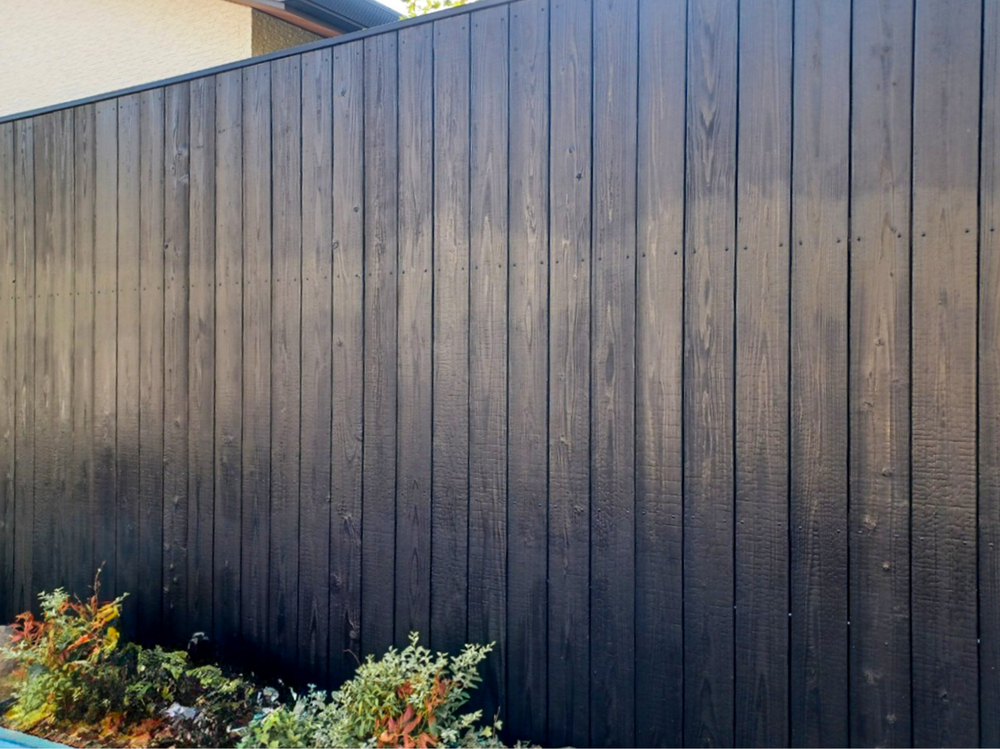 4面を焼いて炭を落とし、黒色に塗装をした焼杉です。板塀・フェンス等にいかがでしょうか。